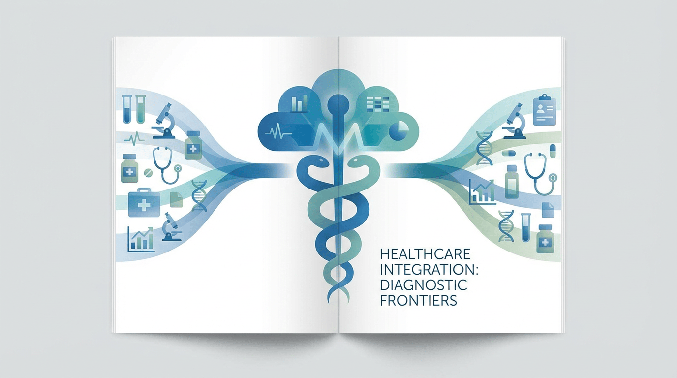 Description: STORY SUMMARY (1-2 sentences): Abbott Laboratories completes its $23 billion acquisition of Exact Sciences, maker of the Cologuard cancer screening test, marking a major expansion into cancer diagnostics. The business deal closes on March 23, 2026, bringing together two major healthcare companies. MUST INCLUDE (core cues): Medical/laboratory setting with diagnostic equipment imagery; Business acquisition theme (merger/integration visual); Cancer screening/diagnostics concept (subtle, professional); Clean, corporate aesthetic. DO NOT INCLUDE (avoid misleading visuals): Abbott or Exact Sciences logos; Specific company branding; Photorealistic corporate executives; Stock market charts or graphs; Factory or manufacturing imagery. STYLE: Modern editorial illustration, clean vector style with subtle depth; Professional business-meets-medicine aesthetic; Blue and teal color palette (healthcare/corporate); Balanced composition, editorial magazine style; Abstract representation of healthcare merger. ASPECT RATIO: 16:9