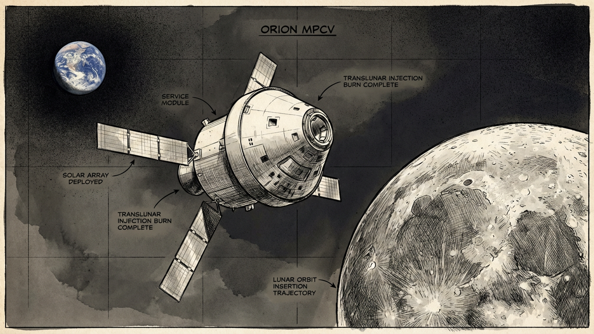 • After initial checkouts in high Earth orbit, Orion completed a translunar injection burn and entered a free-return trajectory that loops around the Moon and returns to Earth.