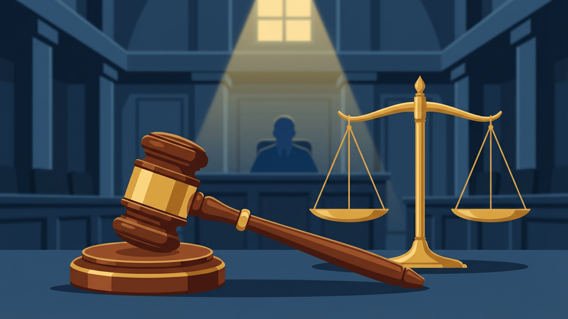 Description: Courtroom scene with gavel and legal documents, editorial illustration style