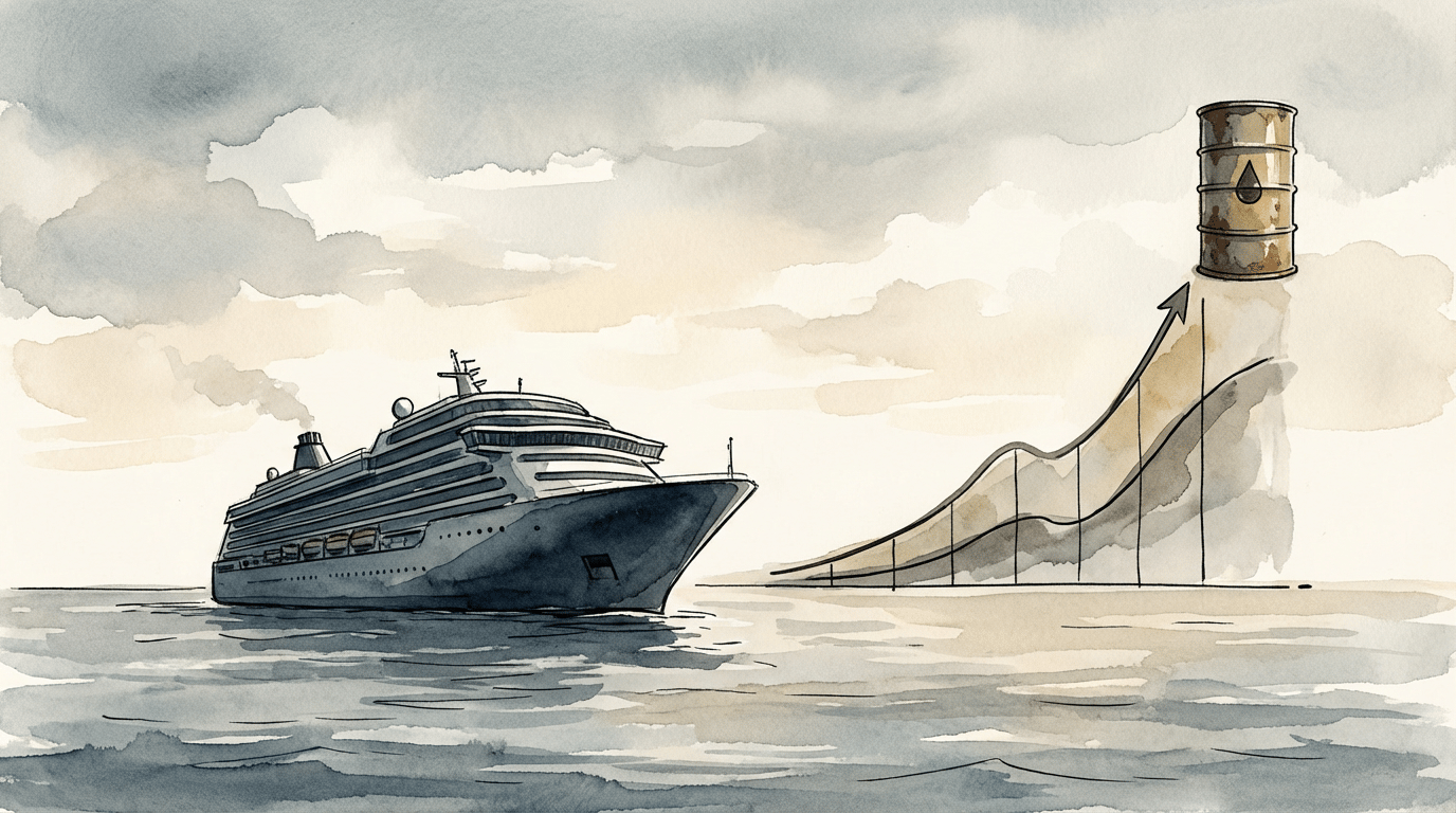 Visual selection: ILLUSTRATION. Hedra Prompt: Editorial illustration, wide 16:9: a sleek modern cruise ship on open ocean beside a subtle upward line graph and an oil barrel motif, symbolizing rising fuel costs affecting a cruise company’s earnings outlook. Muted professional colors, watercolor-and-ink style, soft lighting, no text, no logos, no identifiable people. (Artificial Intelligence generated image / EOBS.biz)