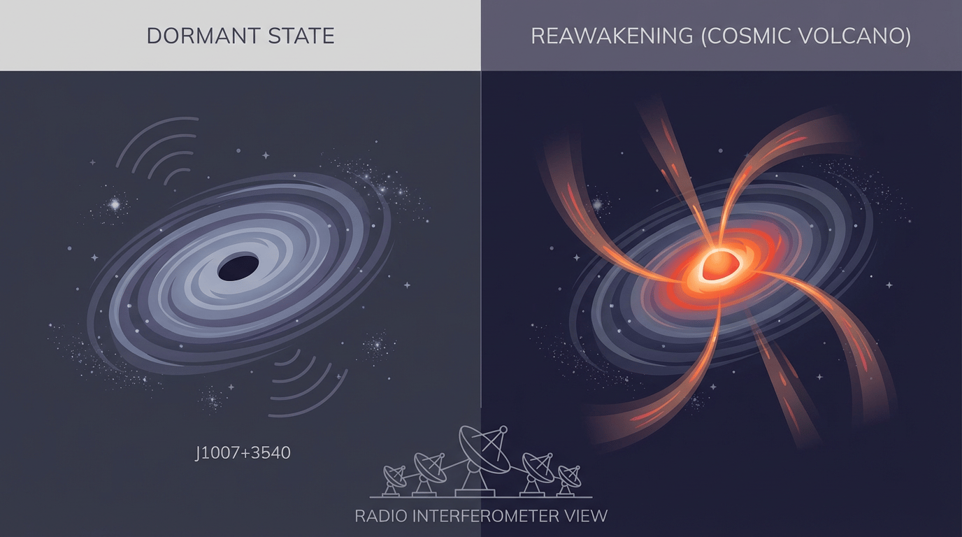 Midnapore, India – Astronomers have captured a stunning view of a supermassive black hole in the galaxy J1007+3540 dramatically reawakening after an estimated 100 million years of dormancy, erupting like a “cosmic volcano” and blasting fresh jets of magnetized plasma across nearly one million light-years of space. This remarkable event, providing one of the clearest views yet of a “reborn” black hole, was reported by the Royal Astronomical Society, Popular Science, ZME Science, Universe Today, Space.com, and ScienceDaily. Each of the bullet points immediately below have been confirmed by at least four of the six respected sources we curated on this story.