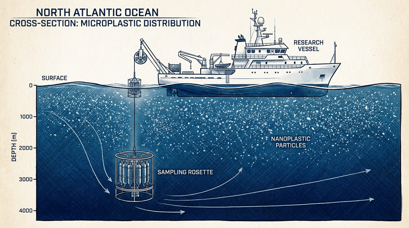 Technical summaries of the work describe sampling across multiple depths, including near-surface water, intermediate depths, and near-bottom waters, with nanoplastics detected throughout the surveyed water column. The available summaries also describe higher average concentrations near the surface than at depth, consistent with surface inputs and mixing patterns. (See: European Commission.)
