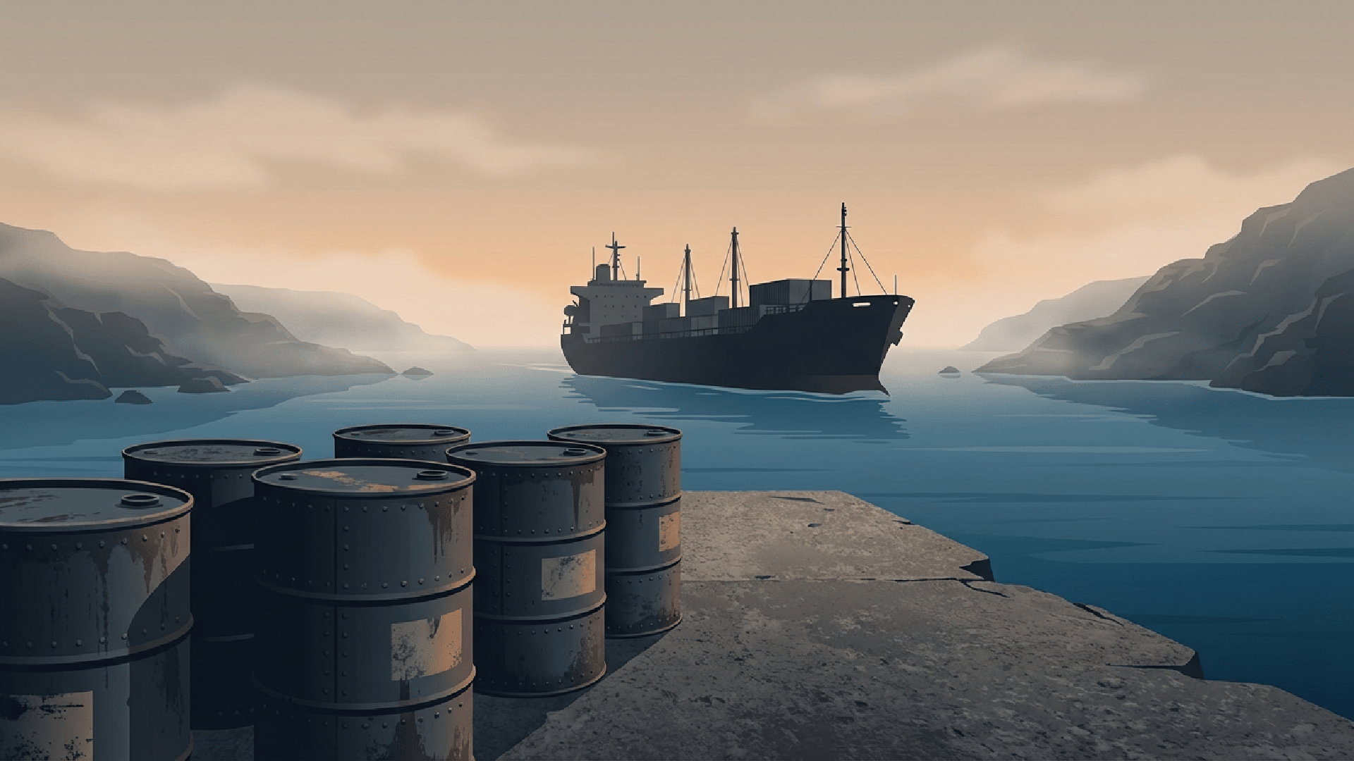Image: Editorial illustration of oil barrels and a tanker silhouette near a narrow strait
