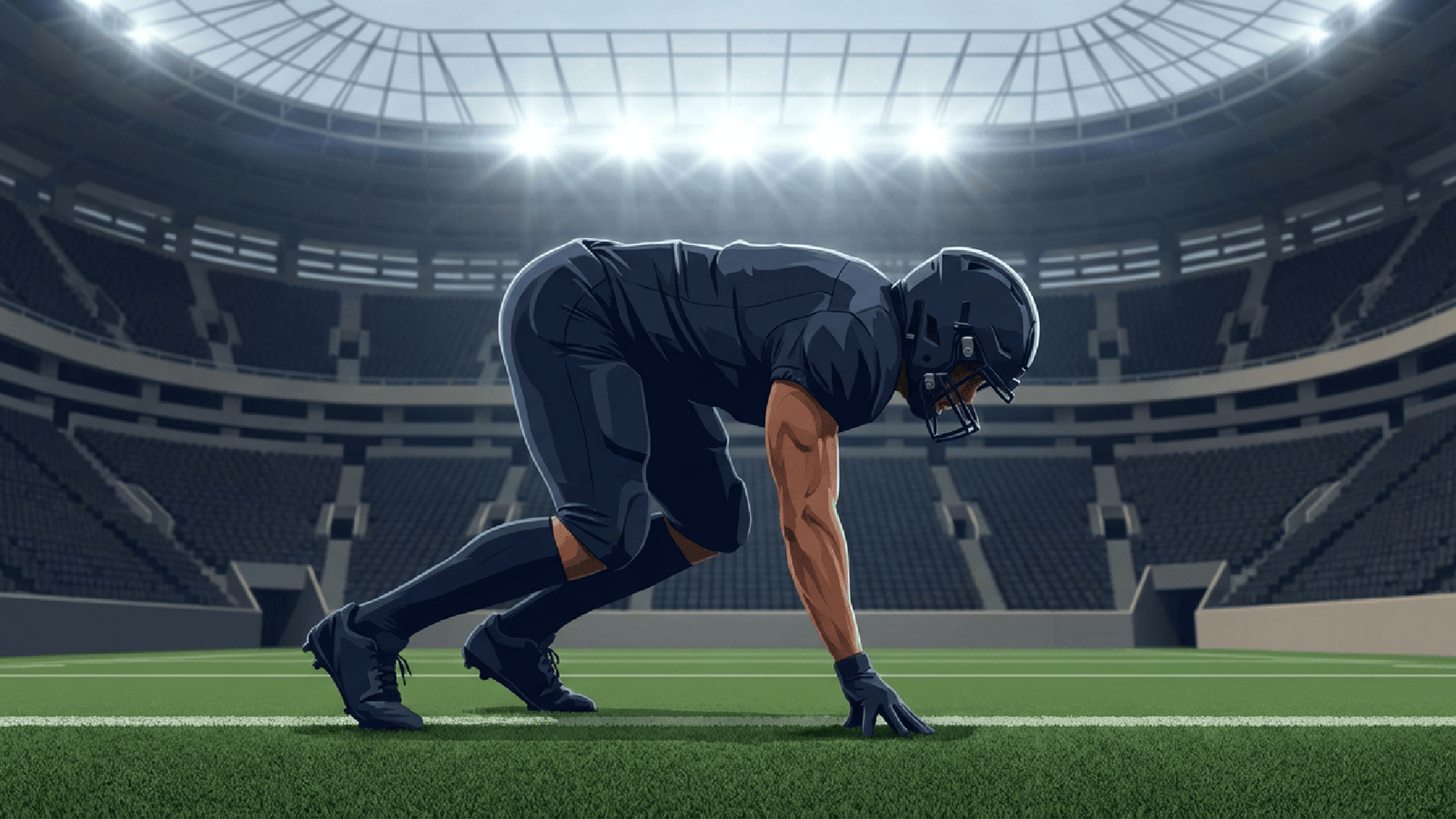 Caption: A generic professional American football defensive end in a stadium setting, illustrating the blockbuster trade of Maxx Crosby to the Baltimore Ravens. (Artificial Intelligence generated image / EOBS.biz)