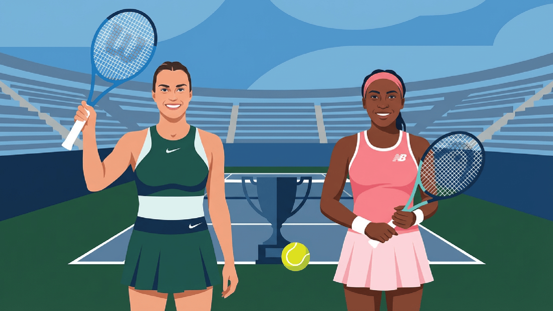 Description: An illustrated editorial sports portrait of Aryna Sabalenka and Coco Gauff with a tennis hard-court stadium backdrop.