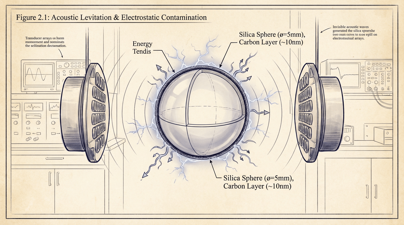 Description: Scientific illustration of a silica sphere suspended by acoustic levitation, showing carbon molecules on the surface and subtle electrical charge visualization. Detailed technical ink-and-wash style, blueprint aesthetic, neutral color palette with blue accents for energy.