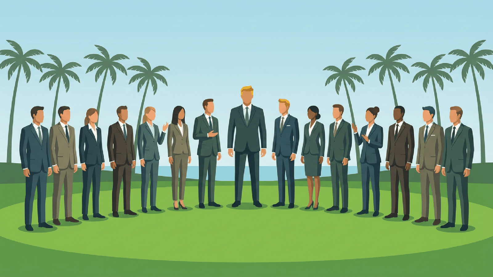 Visual Cues: Palm trees, golf resort greenery, diplomatic atmosphere.