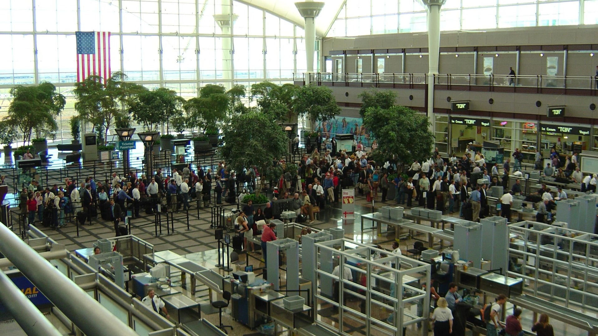 Airport security lines — Kitt Hodsden, via Wikimedia Commons (public domain).
